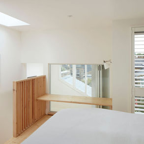 A slatted timber stair and glass balustrade and bench divides the high level portion of the space. The bedroom leads to an en-suite shower room where the walls and floors have been covered in a grey microcement finish completed by timber joinery and white matt finish.